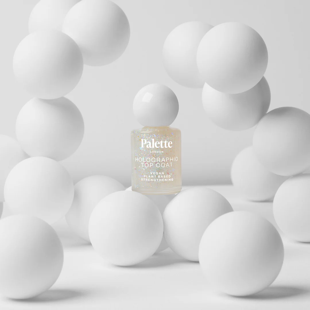 With our holographic top coat, we created the magical effect of trapped light. It’s a way to add understated glamour to nails.